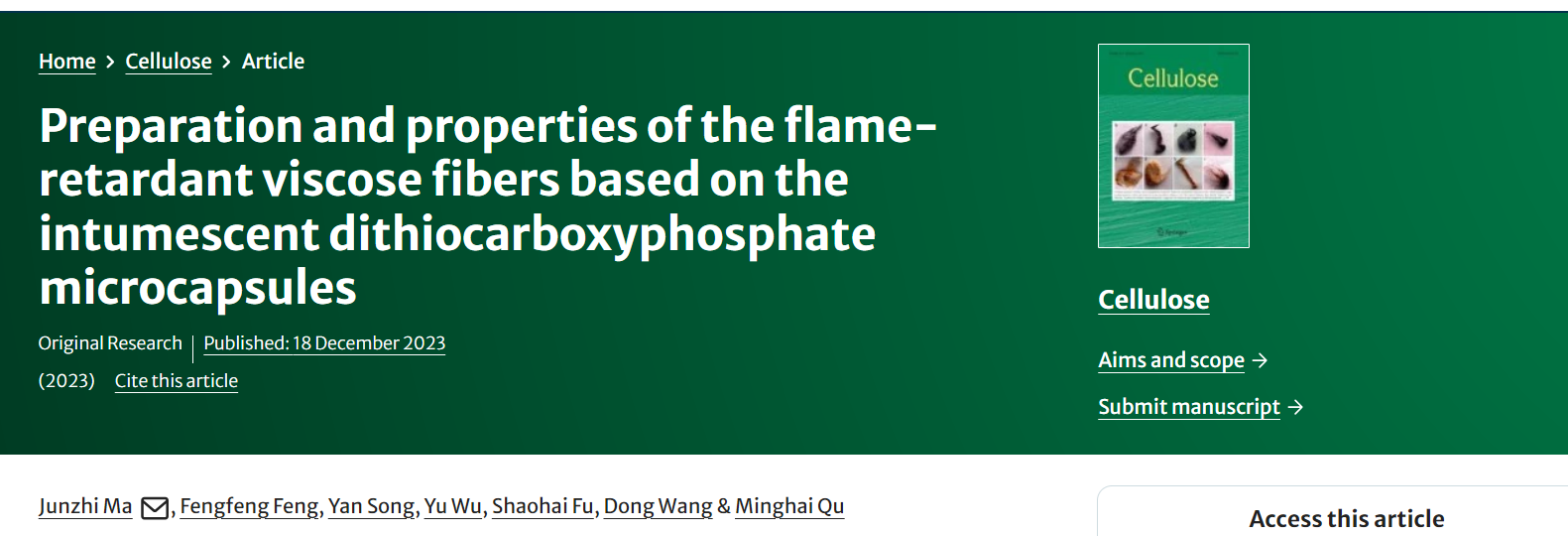近日,中国·ok138太阳集团马君志教授团队与江南大学付少海教授合作,发挥绿色功能纤维与高技术纺织品创新研究院平台优势,在阻燃再生纤维素纤维的制备方面取得较大进展,相关成果以“Preparation and properties of the flame-retardant viscose fibers based on the intumescent dithiocarboxyphosphate microcapsules”为题发表在国际知名期刊《Cellulose》(中科院一区,TOP期刊)。OK138太阳集团为第一完成单位,马君志教授为论文第一作者和通讯作者,江南大学付少海教授、吴彧、王冬为共同作者。