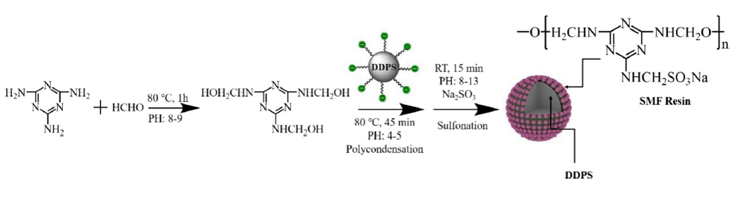 该工作通过原位聚合法在焦磷酸酯(DDPS)表面缩聚生成磺化三聚氰胺-甲醛(SMF)树脂壳层,制备核-壳结构膨胀阻燃剂(焦磷酸酯微胶囊:MDDPS)。通过EDS、TEM、SEM和FTIR对其结构和组成进行了表征,确认了SMF树脂在DDPS表面均匀包覆,形成以SMF树脂为壳材、DDPS为芯材的核-壳结构膨胀阻燃剂。采用共混添加法将MDDPS添加到纤维素溶液,纺丝制备阻燃改性MDDPS/VF复合纤维。磺化改性后的三聚氰胺-甲醛树脂改善了阻燃剂与纤维素分子间界面作用力,保证了纤维的物理机械性能。与常规再生纤维素纤维相比,MDDPS/VF复合纤维pHRR、THR、pSPR和pCPR得到显著降低;炭渣分析纤维表面形成膨胀发泡的炭层抑制传热传质。这项研究提供了一种膨胀型焦磷酸酯微胶囊阻燃剂生产高阻燃再生纤维素纤维的方法。