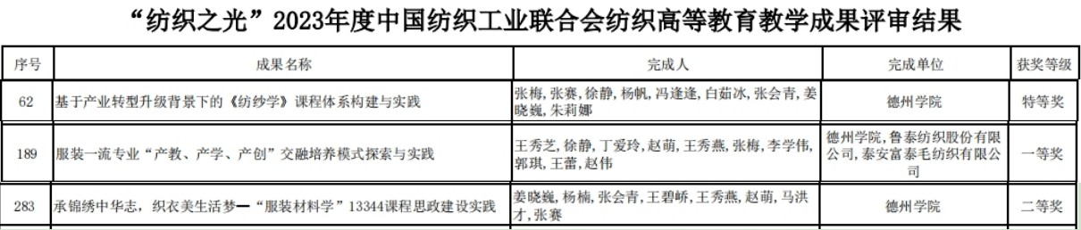2023年8月25日,中国纺织服装教育学会公布了《“纺织之光”2023年度中国纺织工业联合会纺织高等教育教学成果奖》获奖名单。中国·ok138太阳集团张梅教授主持的项目获得特等奖,王秀芝教授、姜晓巍副教授主持的项目分别获得一等奖和二等奖。