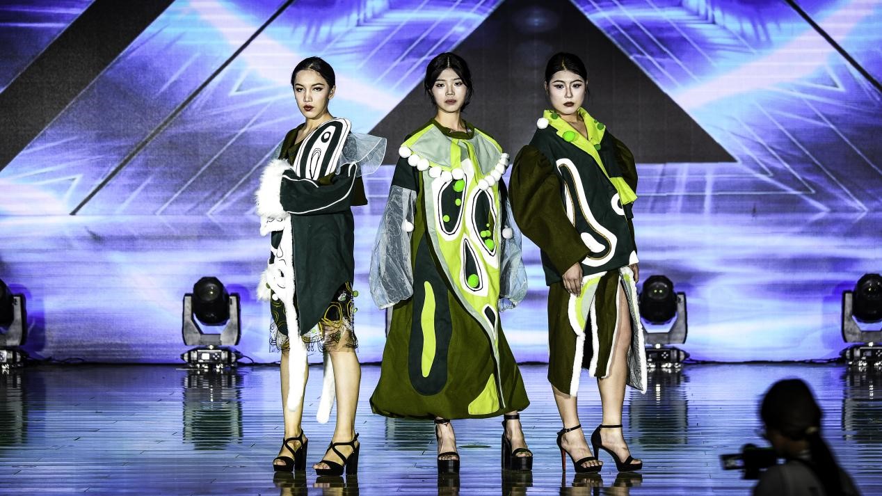 展演共包含自然物化、多元动感、东方新生三大秀场,共展示了2024届毕业班设计师的180套设计作品。第一秀场—《自然物化》以水墨画与自然的交相辉映表现了东方美学与鲁锦的相互交融,展示了中国传统色彩文化的魅力;第二秀场—《多元动感》从运动到废土风,从时尚到终极处,以多重元素与鲁锦的相互交织表达出现代与传统工艺的碰撞;第三秀场—《东方新生》将新中式的活灵活现以及传统建筑跃然服装之上,既有山海经的异兽以及远古的龙文玉佩,也有敦煌的神秘与戏曲的独特,将鲁锦与东方风格完美融合。