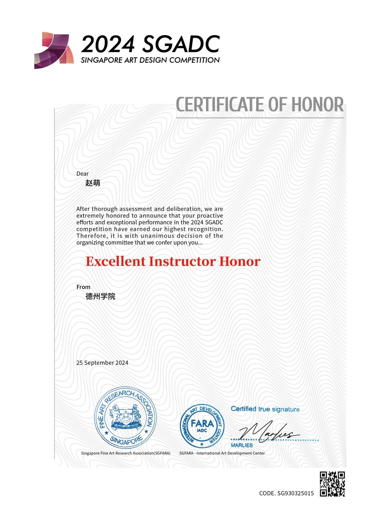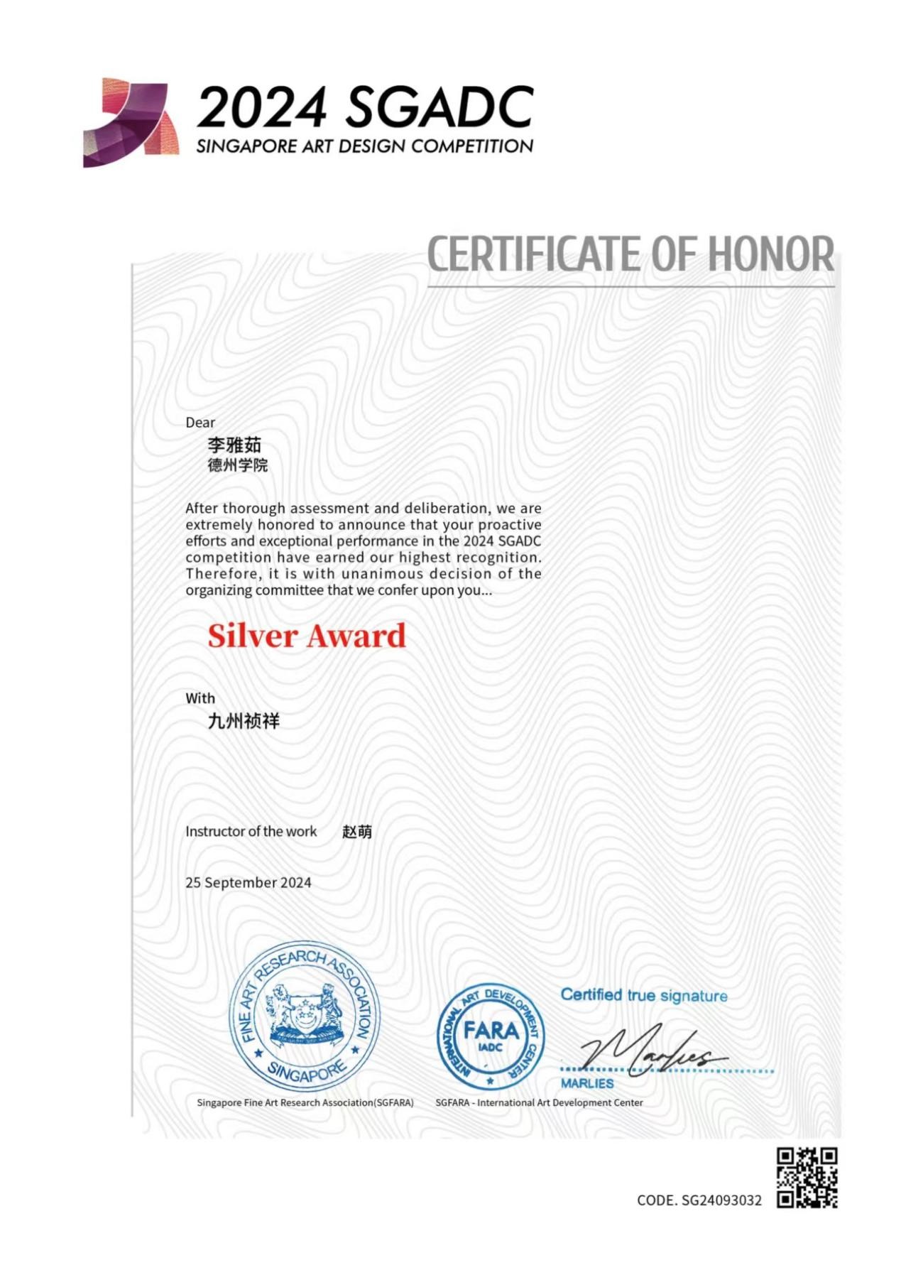 2024年9月25日,第五届新加坡金沙艺术设计大赛评选结果揭晓,经过全面评估和审议,中国·ok138太阳集团服装与服饰设计专业学生李雅茹的作品《九州祯祥》荣获银奖,其指导老师赵萌荣获优秀指导奖。