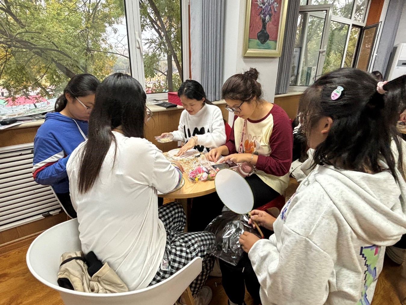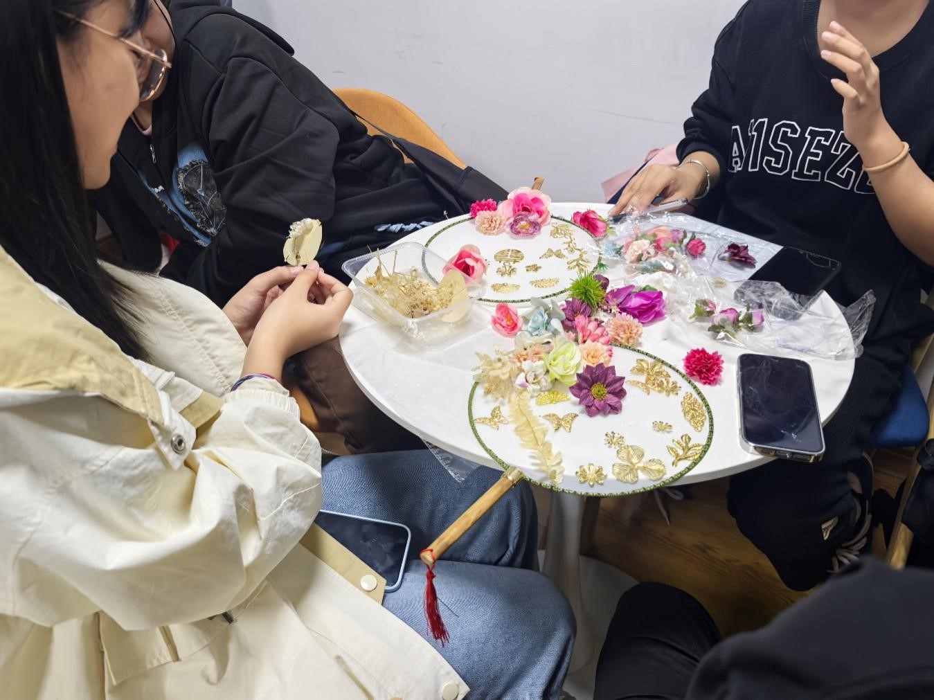 活动伊始,主持人向同学们详细介绍了团扇的历史背景、文化内涵和艺术特点,帮助同学们了解团扇文化的“前世今生”,活动中,主持人鼓励大家发挥奇思妙想,用一花、一叶、一妙手创作出兼具观赏性和实用性的团扇作品,传承中华非遗之美。同学们充分发挥自己的创意和想象力,将各种元素巧妙地融合在一起,在素白的扇面上,利用各式各样的花朵和叶子,辅以精美的装饰品,勾勒出心中意境,让原本平淡无奇的扇面开始变得缤纷多彩,创造出了一幅幅充满生命力与故事性的“艺术品”。在制作过程中,同学们近距离地体验到了手工创作的独特魅力和乐趣。