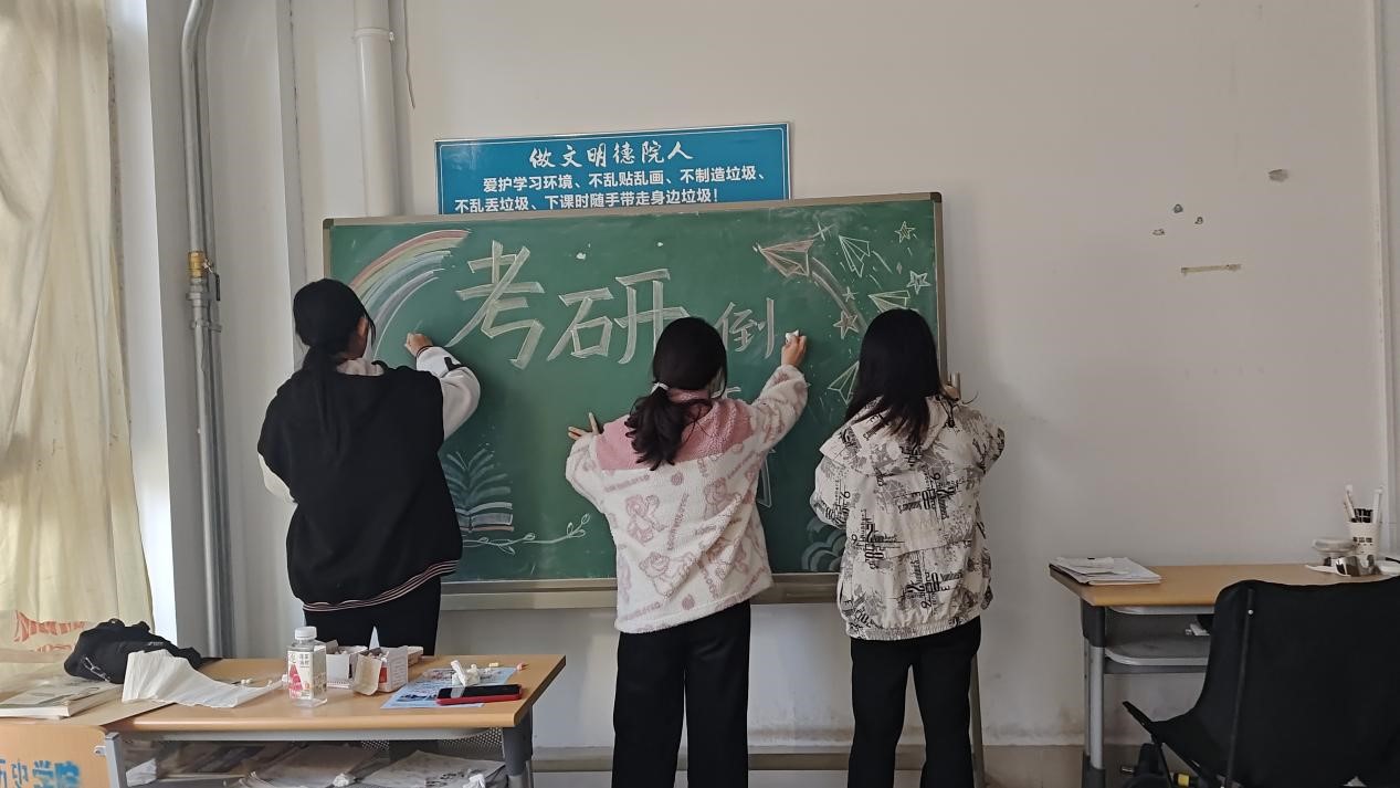 此次暖心服务活动围绕打扫考研教室、制作手工作品、绘制考研加油黑板报、录制考研祝福视频等方面展开。11月22日,学生党员以高度的责任感积极投身教师清扫志愿服务中,对考研教室进行了全面而细致的清扫,为考研学子缔造了整洁、宜人的学习空间,洁净的地面、齐整的桌椅、有序的书本,处处彰显着志愿者们的无私奉献与默默付出。11月23日,社团文艺部组织大一学生在考研教室绘制黑板报为考研学长学姐助力。为了不打扰考研学子的学习,画板报的同学利用课间、就餐时间创作绘制,她们力求完美,反复修改,积极讨论,希望为考研学子带来最真挚的祝福和鼓励。11月22日-25日,我院学生会成员精心策划录制了“研途有我,与你同行”考研祝福视频,一条条视频,一句句祝福都在激励考研学子。