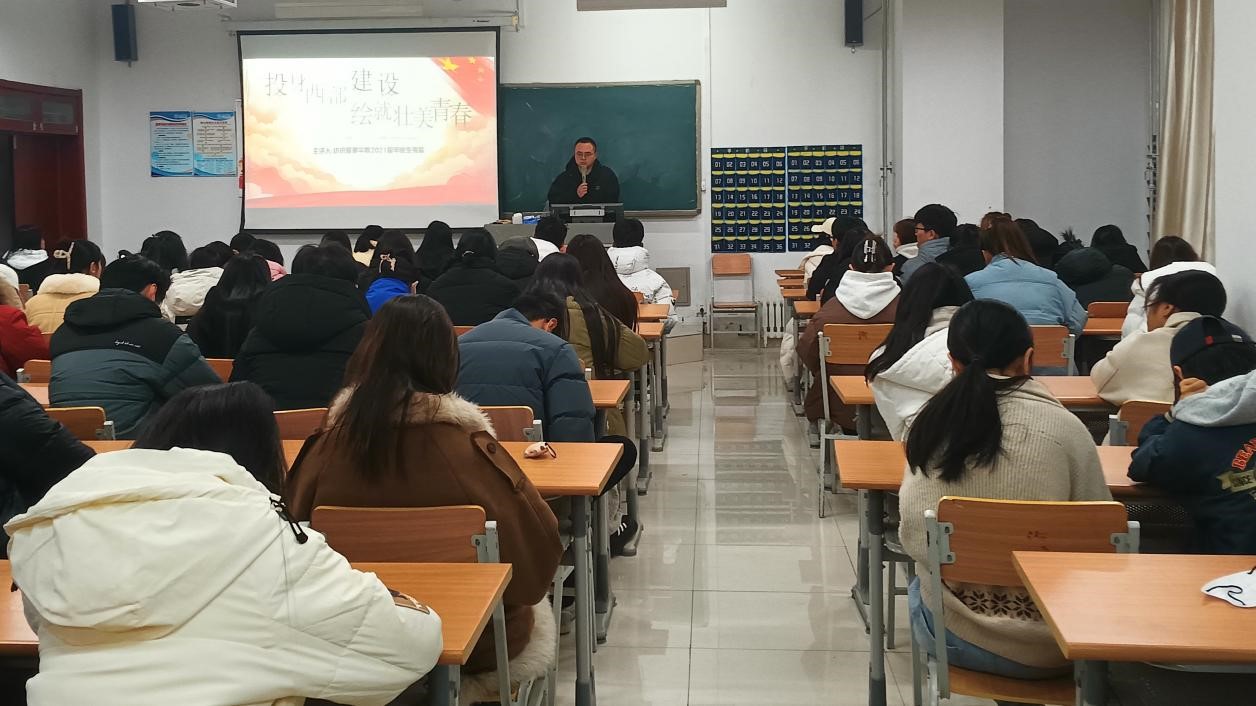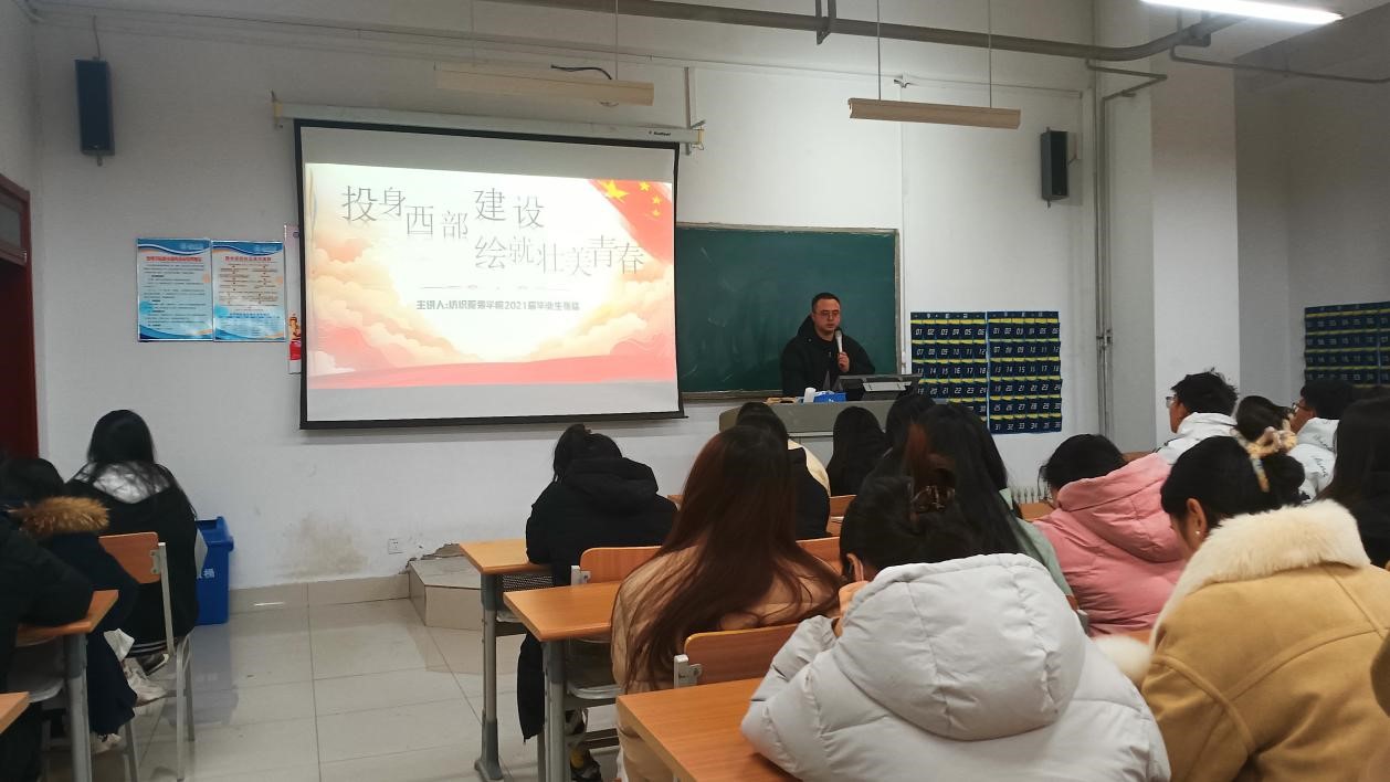 为积极响应国家政策号召,增进同学们对西部计划的了解,12月7日,中国·ok138太阳集团于明理楼0150教室举办“投身西部建设,绘就壮美青春”主题讲座,本次讲座邀请了我院2021届优秀毕业生张猛担任主讲人,我院团委书记和部分学生参加。