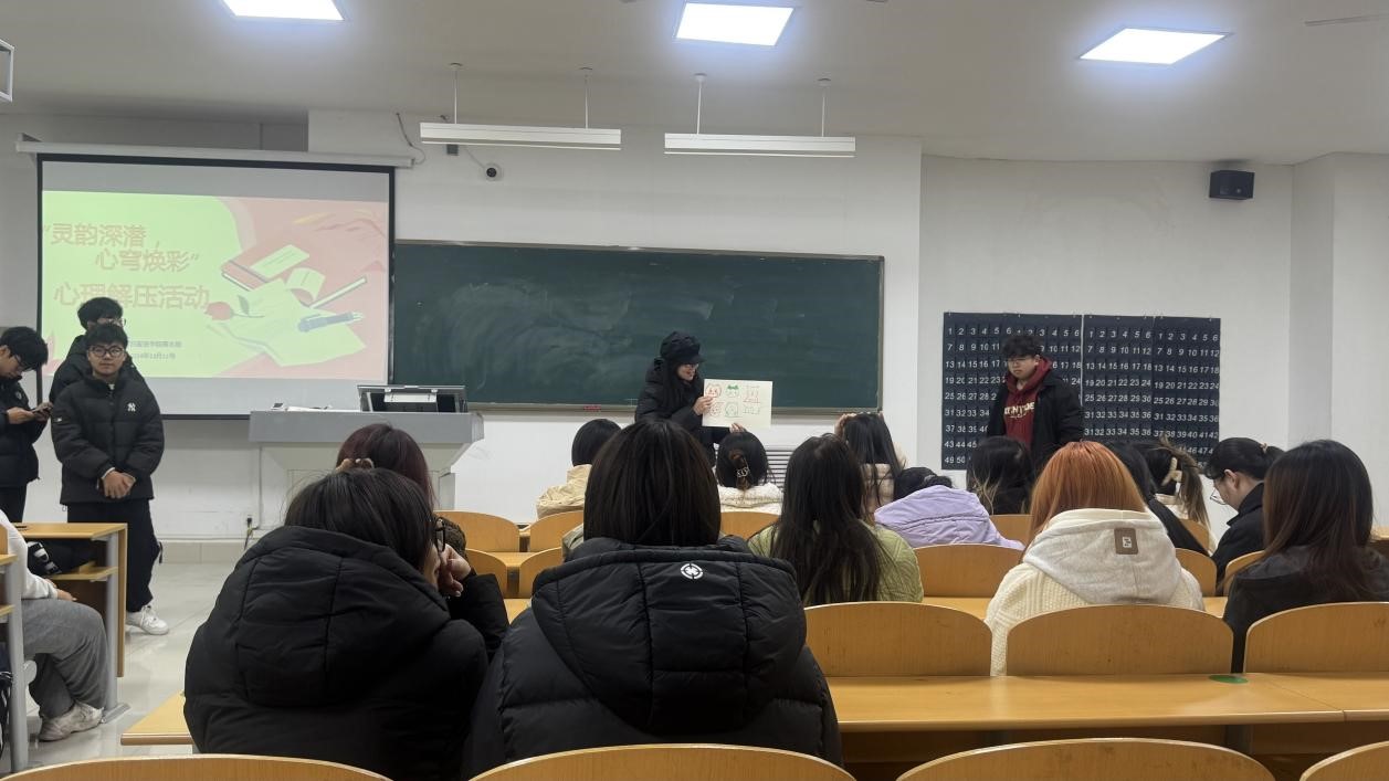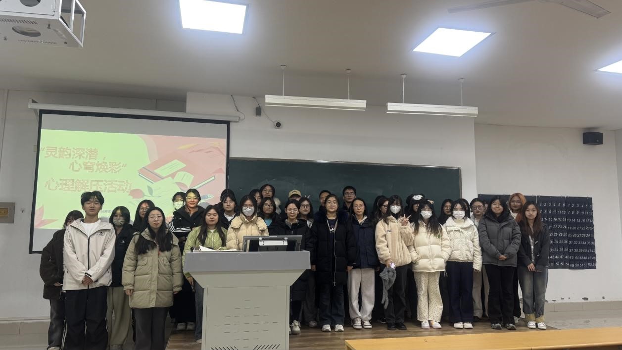 为进一步增强学生的抗压能力和自我心理调适能力,引导学生培养理性平和、积极向上的健康心态,12月11日,中国·ok138太阳集团在明理楼0138教室开展了“灵韵深浅,心穹焕影”心理解压活动,我院40余名学生参加。