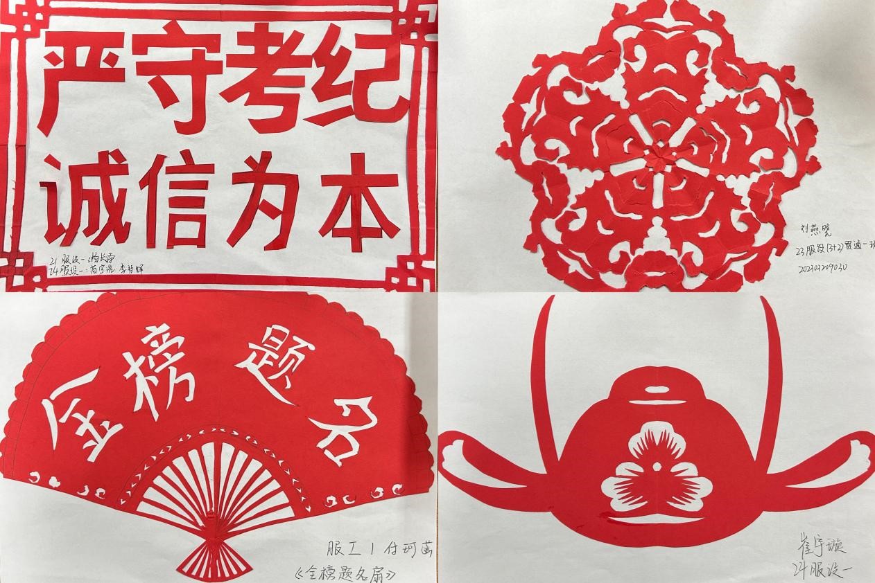 活动伊始,负责人为同学们分发彩纸、剪刀、装饰物和胶水等材料,并将同学们分成4个剪纸小组,以小组为单位进行剪纸创作。在负责人的悉心指导下,同学们在纸上勾勒出图案的雏形,通过翻转、折叠,再经过巧妙地裁剪,逐渐形成了各式各样的图案。“考风清正,学业有成”“严守考纪,诚信为本”“诚信应试,公平竞争”等饱含美好寓意的剪纸作品以及“状元郎”“中国结”“节节高升”等剪纸图案一一呈现在同学们的眼前。从剪纸图案的畅想到剪纸工艺的探索,每一剪都承载着同学们对剪纸文化的热爱和期末考试诚信应考的承诺。
