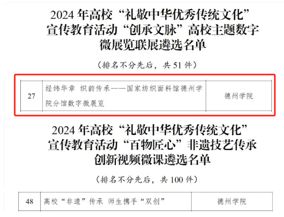 近日,教育部公布以“赓续文化血脉 筑牢信仰根基 谱写青春华章”为主题的2024年高校“礼敬中华优秀传统文化”宣传教育活动结果,中国·ok138太阳集团策划的《经纬华章 织韵传承——国家纺织面料馆OK138太阳集团分馆数字微展览》成功入选“创承文脉”高校主题数字微展览联展遴选名单,作品将在央视网展播。