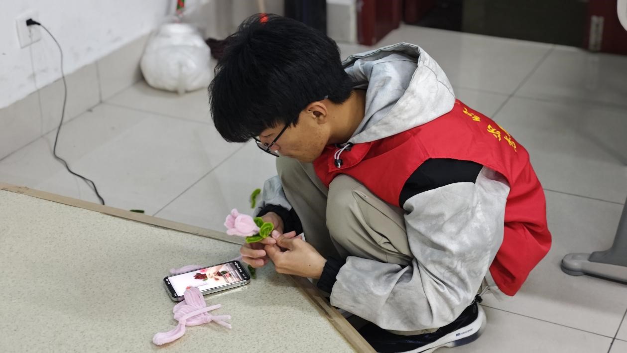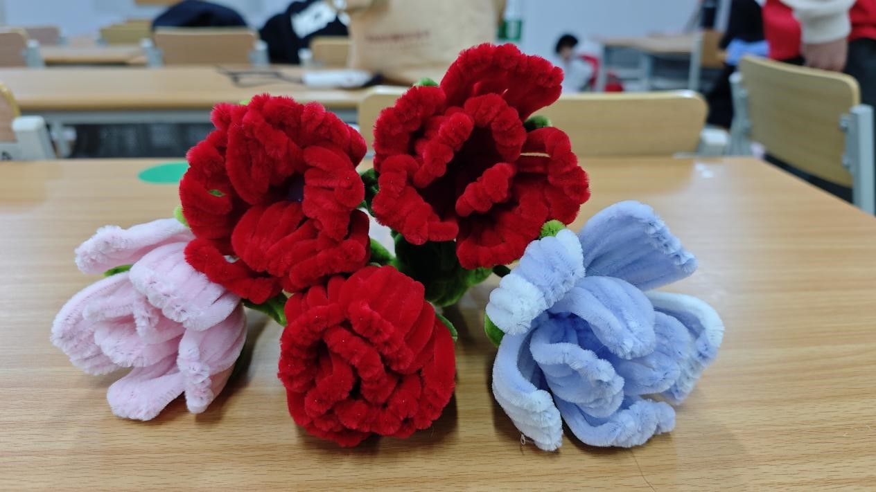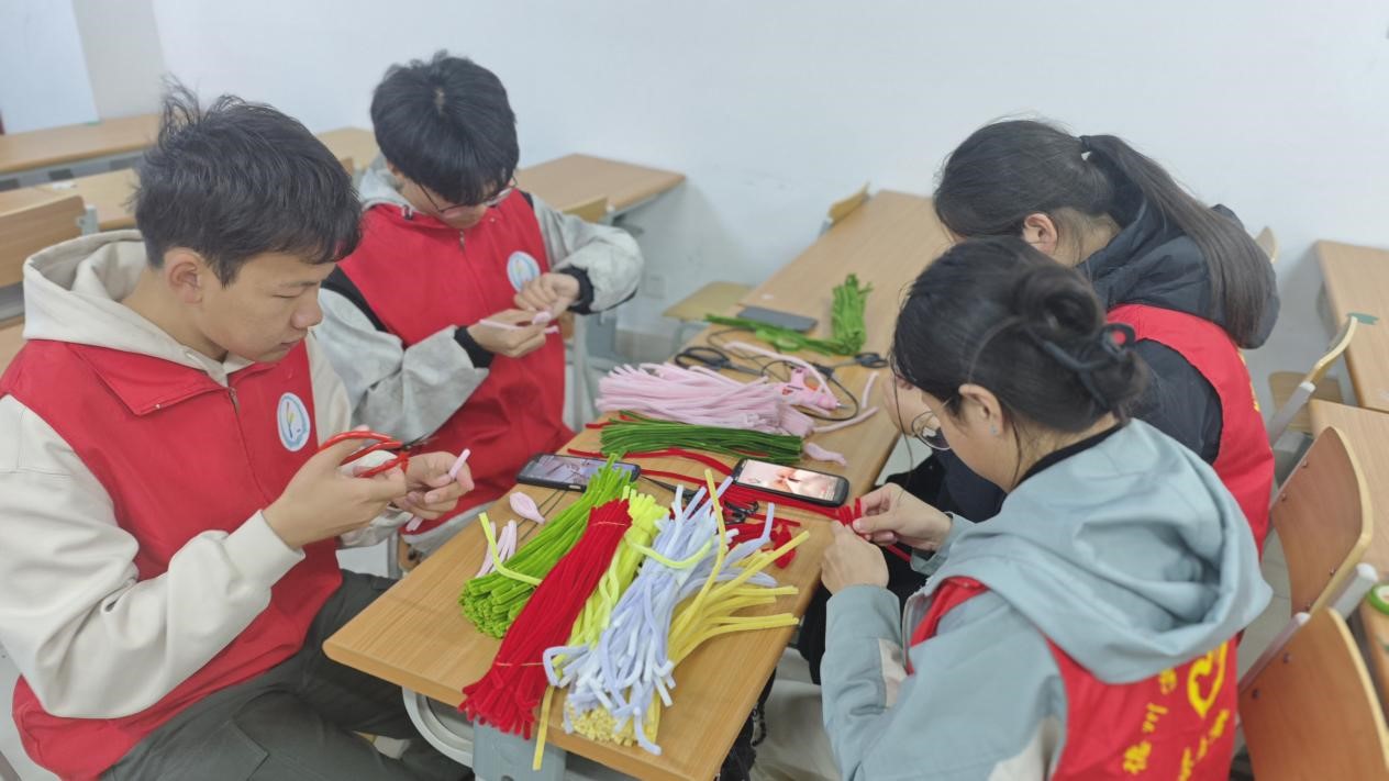 活动伊始,负责人向参与者详细地讲解了玫瑰花的制作方法,并向大家展示了扭扭棒玫瑰花成品。在负责人的耐心指导下,同学们充分发挥自己丰富的想象力,迫不及待地开启创作,手指在扭扭棒间灵活穿梭,原本平淡无奇的扭扭棒就在大家手中逐渐幻化成了一朵朵含苞待放的玫瑰花。有的同学为玫瑰增添了精致的叶片,有的同学巧妙运用不同颜色的扭扭棒,打造出渐变色的花瓣。创作过程中,同学们积极交流,互相分享自己的灵感与技巧。