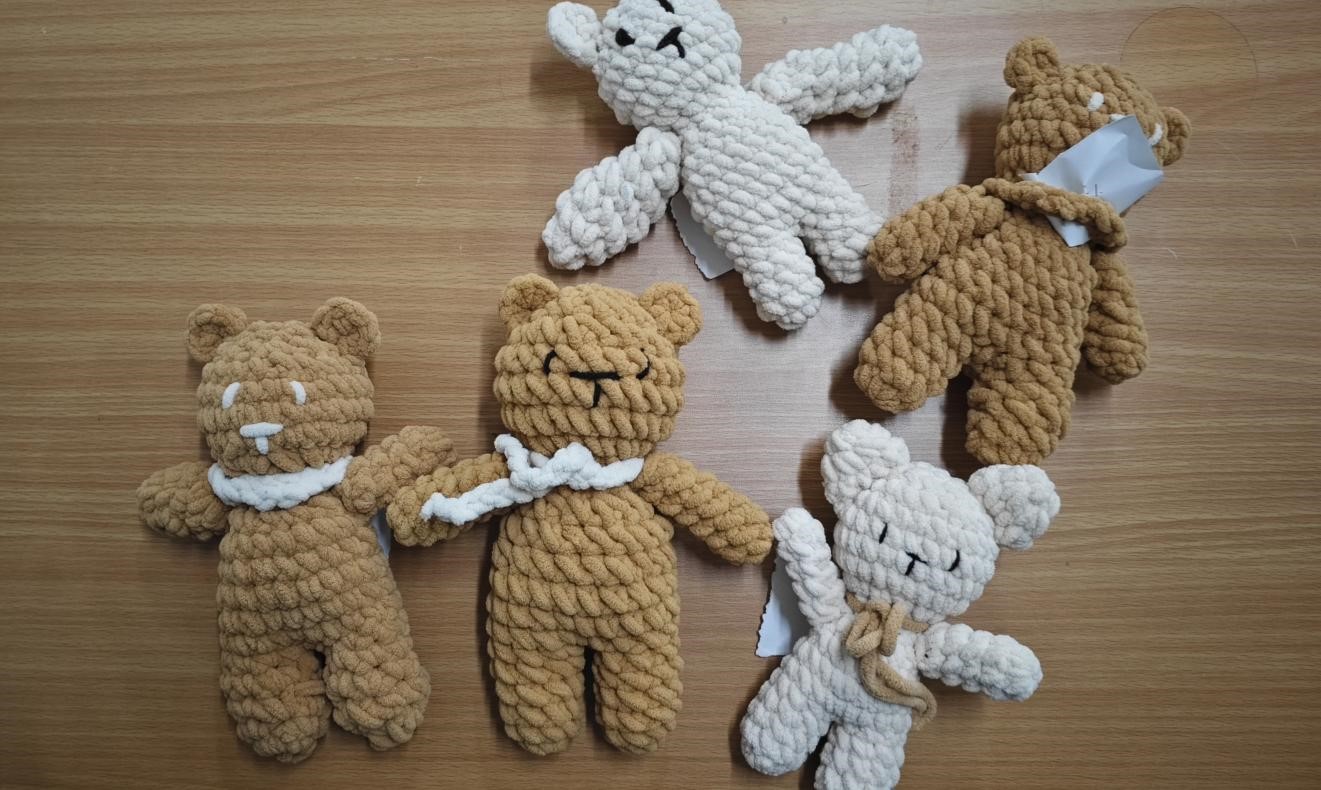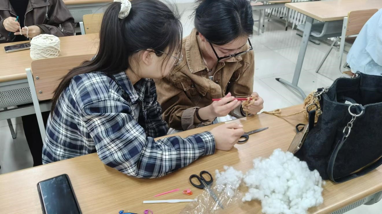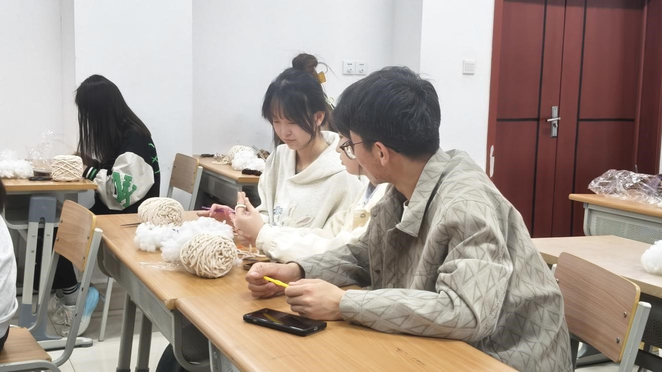 活动伊始,负责人将准备好的毛线、钩针、填充棉等材料分发给同学们,并现场演示了玩偶缝制过程,在负责人的悉心指导下,同学们拿起钩针,跟着教学步骤耐心细致地勾勒出自己心仪的小熊。编织过程中,同学们逐渐掌握了起针、收针、加减针等基础技法,大家一边灵巧地穿梭针线,一边愉快地交流编织心得与生活趣事,时而虚心求教,时而热情分享,教室里洋溢着此起彼伏的欢笑声和热烈的讨论声。经过同学们巧手编织,各色柔软的毛线在均匀针脚地勾勒与精准的加减针技法中渐渐成型,一针一线间,那些憨态可掬的绒线小熊便栩栩如生地跃然于掌上,看着自己手里的小熊,同学们眼中闪烁着自豪的光芒,内心充满成就感。