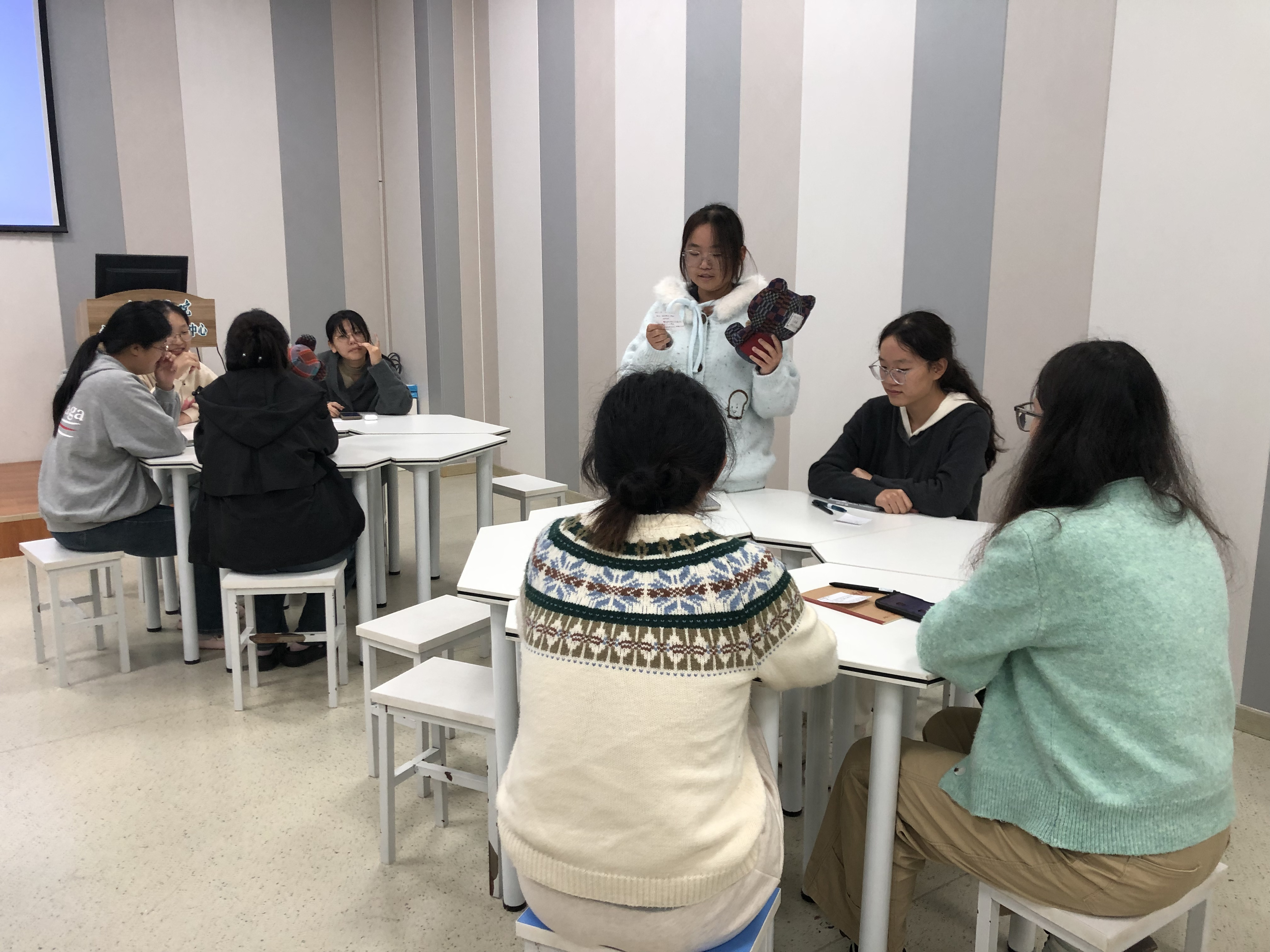 活动伊始,活动负责人向每位同学分发了一只纹样独特的鲁锦玩偶。在负责人的引导下,同学们认真观察手中的玩偶,并在便签上写下其色彩、纹样及所联想到的文化特点,如“蓝色经纬交织,寓意沉稳与智慧”“红黄配色热烈,象征齐鲁大地的质朴与热情”等。随后,大家手持便签在场地内自由走动,根据彼此所写的鲁锦玩偶特点寻找审美相近、志趣相投的伙伴,组成4-5人的临时小组。组队完成后,各小组进入深入交流环节。大家围绕鲁锦布片的文化内涵与艺术特色展开讨论,并结合鲁锦布片的特点进行了生动的自我介绍,分享了个人兴趣、家乡风貌以及对大学生活的期待。在轻松愉快的氛围中,现场笑声与掌声不断,彼此间的陌生感迅速消融。交流结束后,各小组选出一名代表进行总结发言,依次介绍本组鲁锦玩偶的整体风格特点以及各位组员的个性特征,促进了同学间的相互理解与认知。