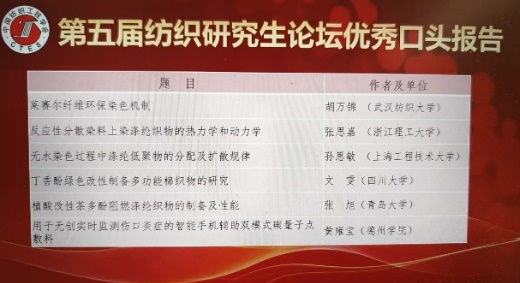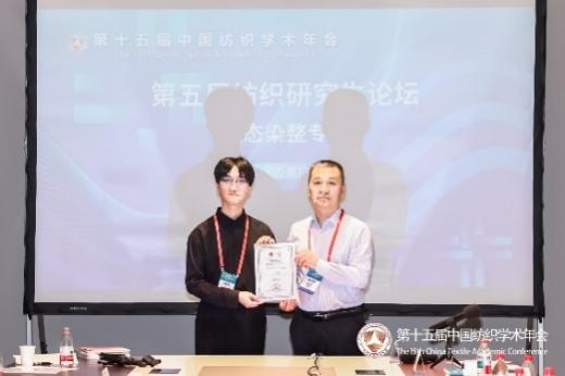 第十五届中国纺织学术年会于2025年10月17-19日在江苏南通召开,我院硕士研究生黄雍宝撰写、杨帆副教授指导,我校为第一完成单位的学术论文《光致变色纺织品的制备及其防伪应用》,成功入围第26届陈维稷优秀论文卓越行动计划,并被推荐至《纺织学报》快速发表。同时,黄雍宝同学在第五届纺织研究生论坛上表现出色,荣获大会颁发的“优秀口头汇报”奖。