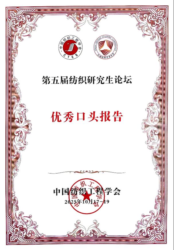 近日,从江苏南通举办的第十五届中国纺织学术年会传来喜讯,我院学子在中国纺织领域两项顶级学术活动中斩获佳绩。由硕士生黄雍宝撰写、杨帆副教授指导,我校为第一完成单位的学术论文《光致变色纺织品的制备及其防伪应用》,成功入围第26届陈维稷优秀论文卓越行动计划,并被推荐至《纺织学报》快速发表。同时,黄雍宝同学在第五届纺织研究生论坛上的出色表现,荣获了大会颁发的“优秀口头汇报”奖。