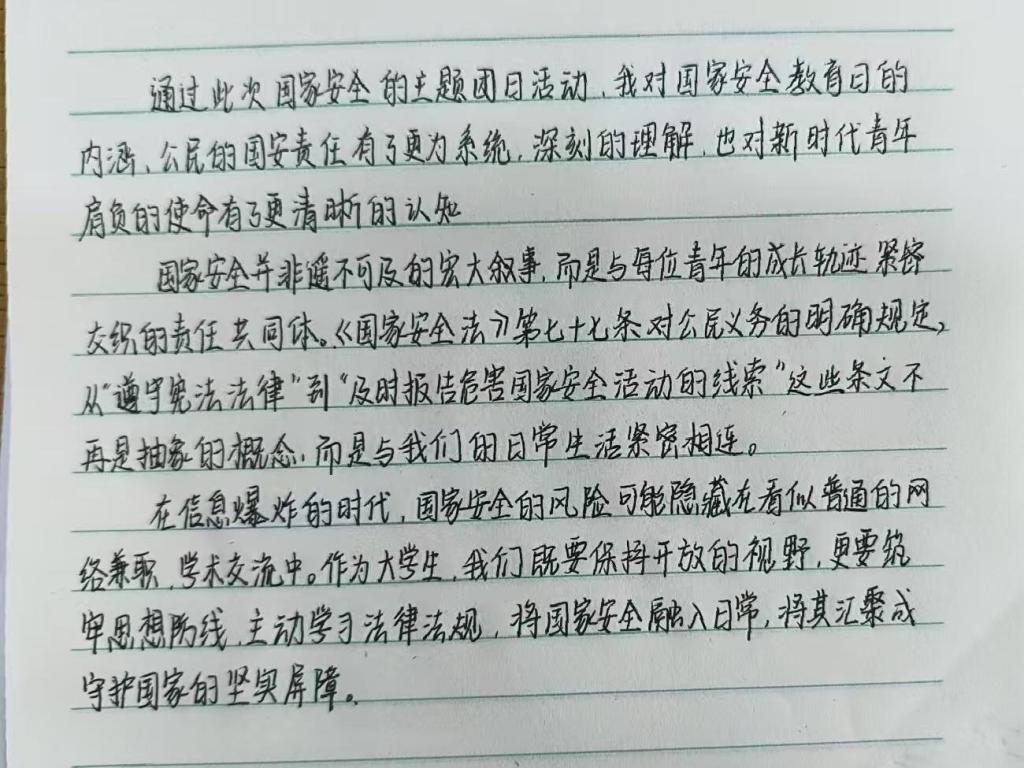 本次主题团日活动让广大团员青年深刻领悟了总体国家安全观的丰富内涵,进一步明确了维护国家安全的法律义务和行动方向,有效增强了学生的风险防范意识与责任担当。下一步,学院将持续推动国家安全教育常态化、制度化,将其融入人才培养全过程。