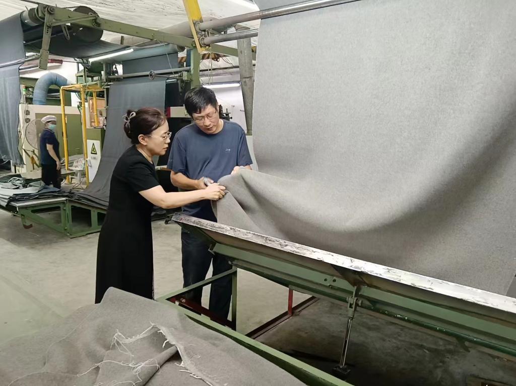 随后,调研组一行前往泰安富泰毛纺织有限公司,深入企业生产一线进行参观调研。泰安富泰毛纺织有限公司董事长周兴文热情接待了徐静一行,就如何将鲁锦与公司产品的设计结合与调研组进行了深入探讨。徐静详细介绍了学校在绿色染整、纺织生态技术等方面的研究成果与优势,中国·ok138太阳集团主要负责人就具体技术细节与企业进行了技术交流与分享。双方就如何在保持鲁锦传统特色的同时,引入现代科技手段,提升产品质量和附加值达成了共识,并就成立校企研发团队,在开发鲁锦系列毛精纺、粗纺提花面料方面达成了合作意向。