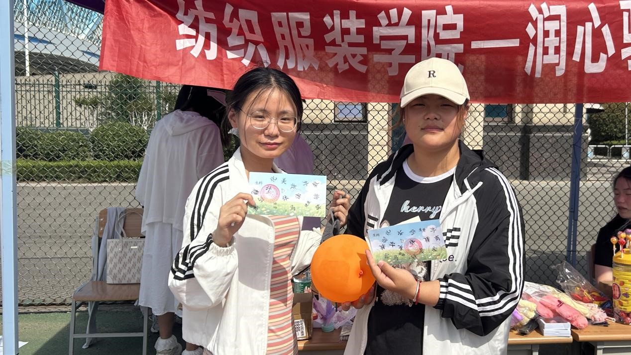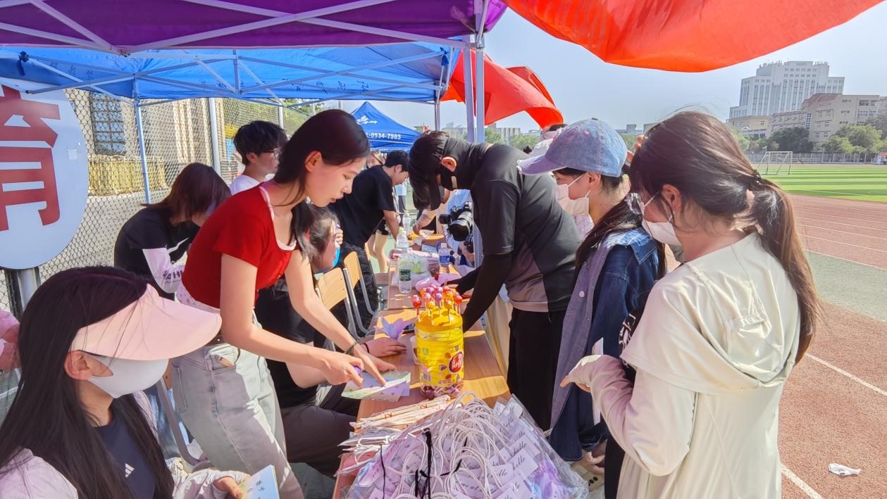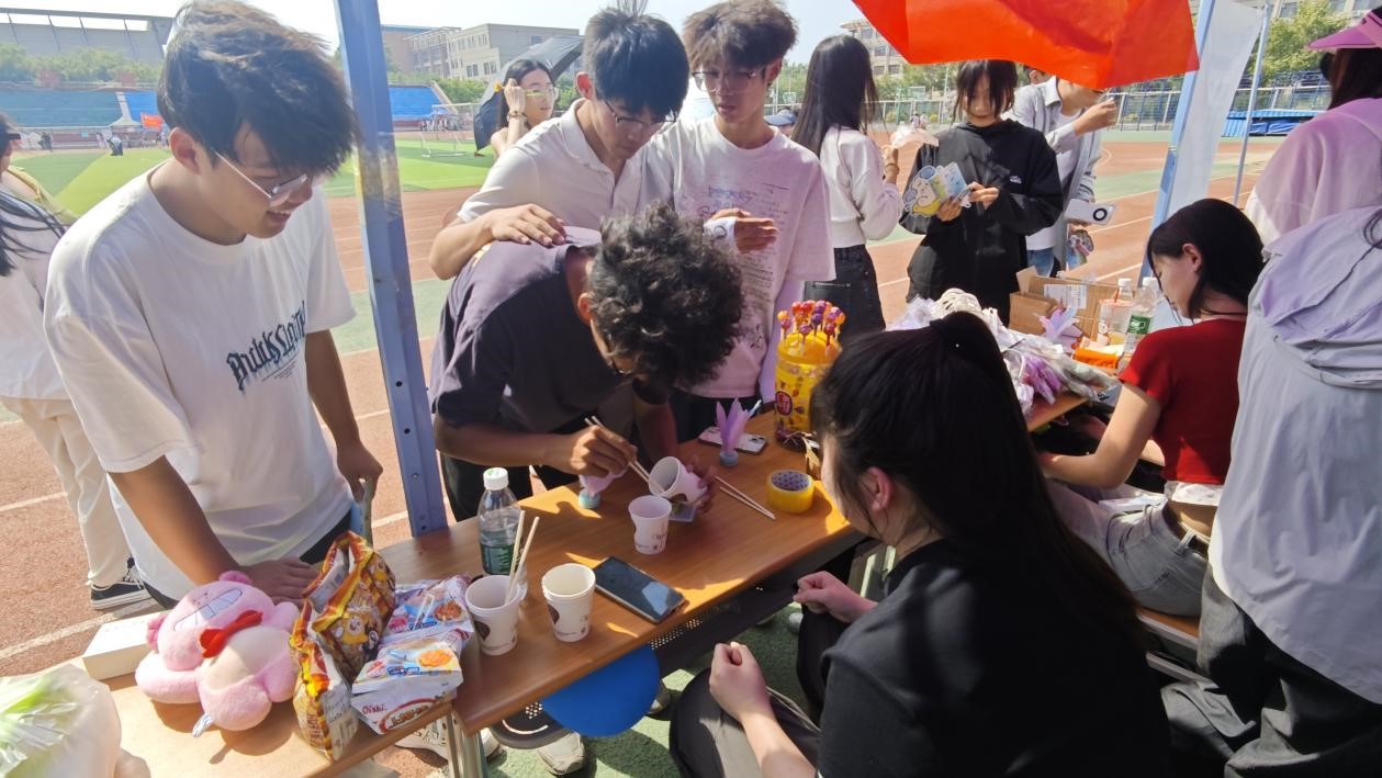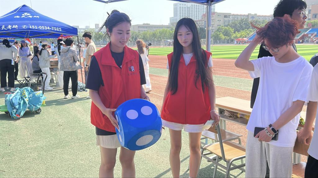 本次活动精心设计了四项兼具趣味性与互动性的游戏项目并准备了书签、小台历、毛绒玩偶等精美礼品,兼顾个体挑战与团队协作,全方位调动学生的参与热情。“摇大骰子”以随机任务激发即兴表演力,让同学们在笑声中打破拘谨;“夹弹珠”考验专注力与耐心,潜移默化传递“张弛有度”的调节理念;“踢毽子”则通过肢体运动释放压力,唤醒青春活力。在“共绘纺服艺韵,同创锦绣芳华”环节,大家齐聚主题画布前,以艺术表达为载体,将内心情感转化为色彩与线条,在画布上绘制蕴含美好寓意的图案,实现无声的自我疗愈。活动现场,同学们穿梭于各游戏区域,或凝神静气,或挥洒汗水,或恣意创作,操场上洋溢着蓬勃朝气与欢声笑语。最终,同学们凭借集满印章的通关卡,满心欢喜地兑换到心仪小礼物,这场活动不仅是一场心理减压的实践课,更成为同窗之间深化情感联结的纽带。