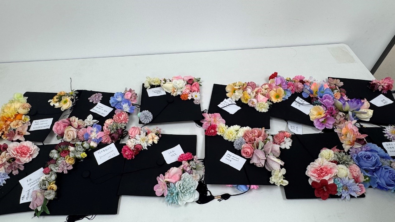 活动负责人详细讲解了簪花技巧和制作注意事项,并为同学们分发了学士帽、仿真花、剪刀等材料。在制作过程中,同学们充分发挥想象力与创造力,将各色绸缎、丝线、珠片等材料,精心制作成一朵朵形态各异、绚丽多彩的花朵,再巧妙地装饰在学士帽上。原本简洁的学士帽在同学们的巧手下,摇身一变成为承载着独特创意与美好回忆的专属毕业礼帽,寄托着学弟学妹对毕业生的祝福和期许。参与活动的阳清帆同学表示:“亲手装饰学士帽送给即将毕业的学长学姐,非常有纪念意义,祝愿学长学姐毕业快乐,一路繁花相伴!”
