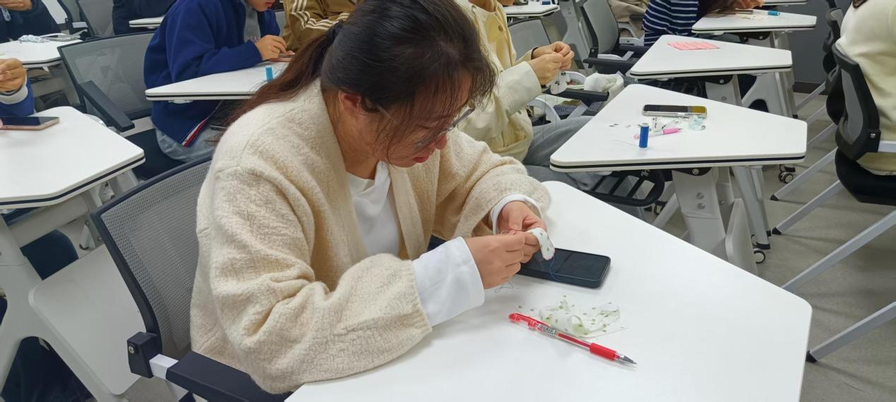活动伊始,同学们充分利用现场备好的布料、纽扣、针线等材料,发挥想象力与创造力,有条不紊地进行裁剪、缝制、装饰等操作。大家专注投入,按照各自的构思逐步创作,从布料选取搭配到细致缝合,再到纽扣等装饰的巧妙点缀,每一个环节都认真对待,精雕细琢,多款风格的迷你布艺作品依次呈现,每一件都凝结着同学们的巧思与对生活美学的独特理解。参与同学纷纷表示,此次活动不仅是一场指尖的创意实践,更让大家在动手过程中感受到了手工制作的独特乐趣。