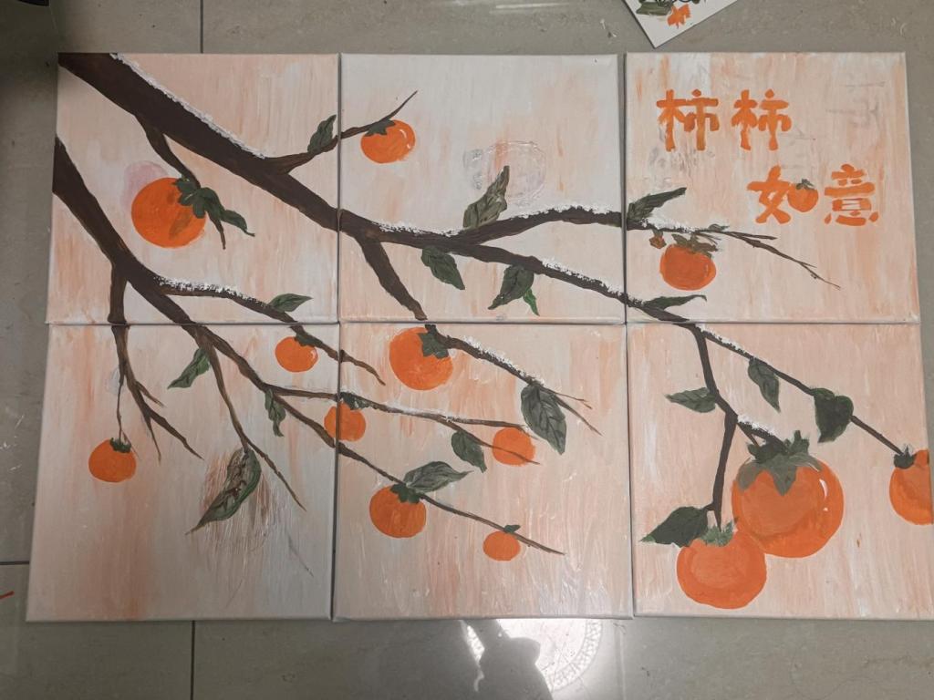 巧释红柿寓意,创意引思路。社团负责学生结合民俗故事,为同学们细致解读了红色柿子象征“事事如意、阖家团圆”的文化寓意,为让创作思路更清晰,社团负责人安排同学依次完成单幅红柿主题作品,最终将所有作品拼接成一幅完整画卷,象征“众心齐聚,共筑团圆”。同学们纷纷拿出纸笔记录灵感,现场讨论氛围愈发浓厚。
