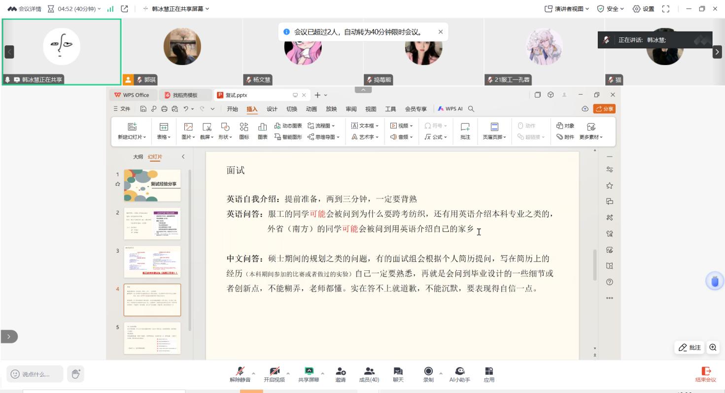 在经验分享环节,四位2024届优秀毕业生分别从不同角度分享了自己的复试经历,内容涵盖简历制作、笔试及面试的备考、录取情况、如何联系导师、调剂注意事项等多个方面,鼓励同学们继续保持学习状态,为复试做好充分准备。