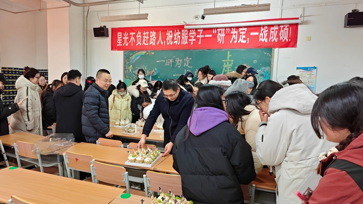 会上,服装工程系主任进行考前动员,她凭借丰富的教学经验和对考研形势的精准把握,为同学们进行了详细的考前指导,从考试科目复习要点、考场应试技巧等方面进行了深入讲解,为同学们提供了宝贵的备考策略。我院院长发表讲话,他深入剖析了当前考研竞争的激烈态势以及考研对于个人成长和学院发展的重要意义。他指出,考研是同学们追求学术进步、提升自我竞争力的重要途径,也是展现学院教育教学成果的重要方式,院长鼓励同学们要坚定信念,保持积极心态,勇敢面对考研过程中的各种挑战。我院党委副书记在讲话中,着重强调了考前心态调整的重要性,他以亲切的话语叮嘱同学们要学会放松身心,避免过度焦虑,以最佳的精神面貌迎接考试。宣誓环节,全体考研学子紧握右拳,以铿锵有力的声音庄严宣誓,展现出考研上岸的坚定决心和必胜信心。此外,学院精心准备了考试文具用品,由学院负责人分发给考研学子。同时,在温馨的互动环节,学院为每位考研学子送上了特别的礼物——带有考研学子名字的小蛋糕,这份甜蜜的礼物不仅是对同学们辛苦备考的认可和鼓励,更象征着学院对他们的美好祝福,希望考研学子能以笔为戈,披荆斩棘,收获甜美果实。